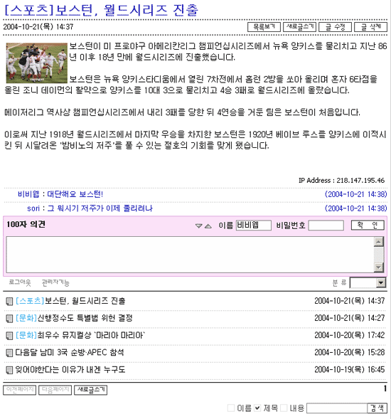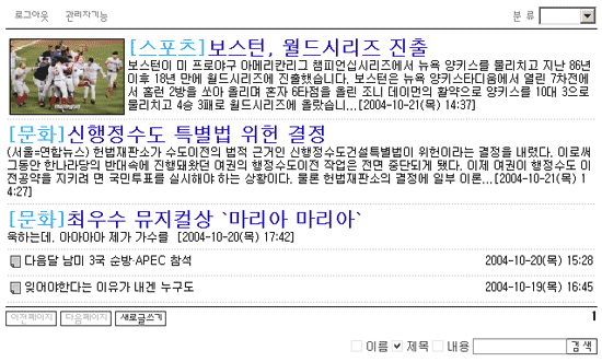 신문기사 스타일의 게시판 추가했습니다. 오즈웹2006.12.08 03:06:05 조회7320 오즈웹 홈페이지빌더에서 사용할 수 있는 게시판 스타일중 아래와 같은 신문목록 스타일의 게시판을 추가하였습니다. 게시판 목록부분에서 간단한 내용까지 보여줄 자료의 건수를 지정할 수 있습니다. 건수를 얼마나 지정하냐에 따라 모든 목록이 내용요약 스타일로 보일수도 있고 몇건만 보일수도 있겠죠. 최소한 간단하게 제목,내용 및 등록일만 보여줍니다.