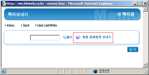 쪽지함 기능에서 회원전체에게 보내기 기능 추가 오즈웹2008.08.07 07:43:38 조회7747 오즈웹홈페이지빌더에 아래그림처럼 쪽지함에서 회원전체에게 보내는 기능을 추가하였습니다. 단, 관리자권한을 갖는 회원만 사용가능한 기능입니다. 참고로 쪽지함은 회원로그인후 보이는 회원명 좌측의 메모그림을 클릭하여 접속가능합니다. 쪽지함은 1년간 보존가능하며 1년이 지난 쪽지는 자동 삭제됩니다.
