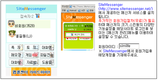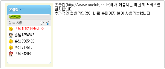 홈페이지에 메신저창 쉽게 붙이는 방법 오즈웹2008.09.16 02:08:13 조회7546 온클럽이나 사이트메신저사이트에서 제공하는 웹메신저를 빌더에서 쉽게 등록할수 있도록 모듈을 추가하였습니다. 해당업체에서 제공하는 스크립만을 이용하는 경우는 홈페이지에 로그인시 회원명으로 자동으로 보여주는 기능을 구현하기위해서는 고객님이 직접 프로그램을 만들어야 하는 어려움이 있었으나, 모듈에서는 이러한 기능을 자동으로 구현해놓았습니다. 모듈위치 : 잡동사니/메신저 입니다. 사용권한 : 모든 웹호스팅 서비스 고객
