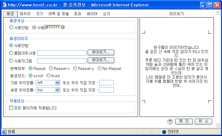 : 배경이미지의 반복모드를 선택합니다. 각각의 옵션을 클릭하면 미리보기화면에 보이므로 쉽게 이해되실것입니다.