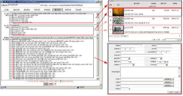 [항목설정]탭에서 정의한 항목들을 이용하여 실제 리스트화면,등록화면(내용보기화면)의 디자인을 하는 부분입니다.