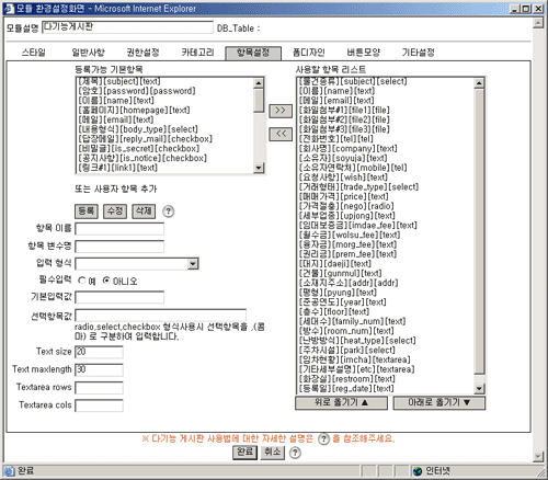 항목설정페이지에서는 글등록화면,리스트화면 및 내용보기화면에서 사용할 항목들을 지정하는 페이지입니다.