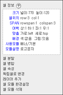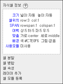 크기 : 셀의 크기입니다. 단위는 px 이며, [자동]인경우는 전체 페이지의 넓이(높이)에서 인접한 셀이 지정한 크기를 제외한 나머지 크기를 자동할당하게 됩니다.