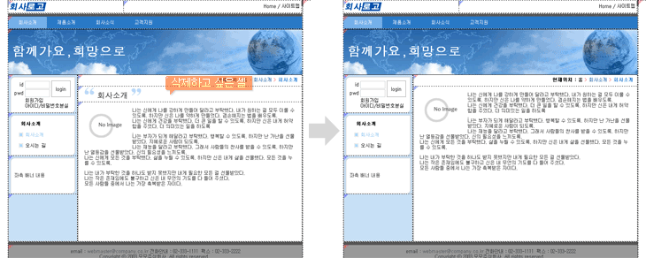 위의 그림에서 만약에 "함께가요,희망으로" 가 들어있는 셀에서 병합작업시에는 상단셀과는 병합이 가능하지만 하단셀과는 병합할 수 없습니다. 이유는 하단셀은 좌우로 분할된 상태이기 때문입니다.