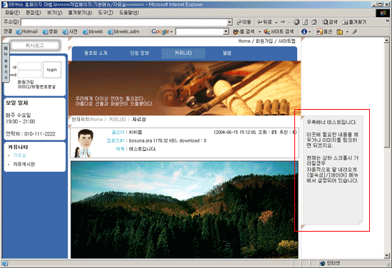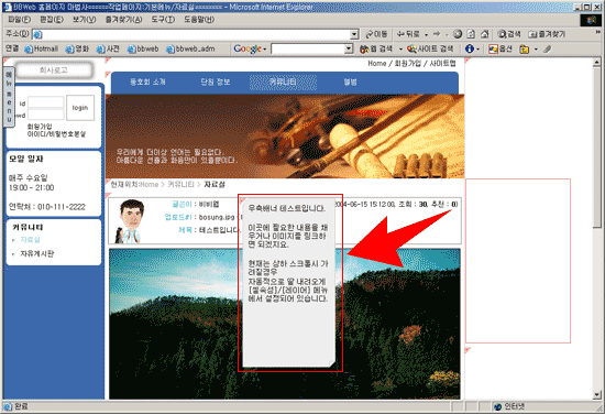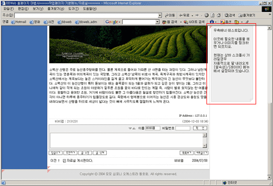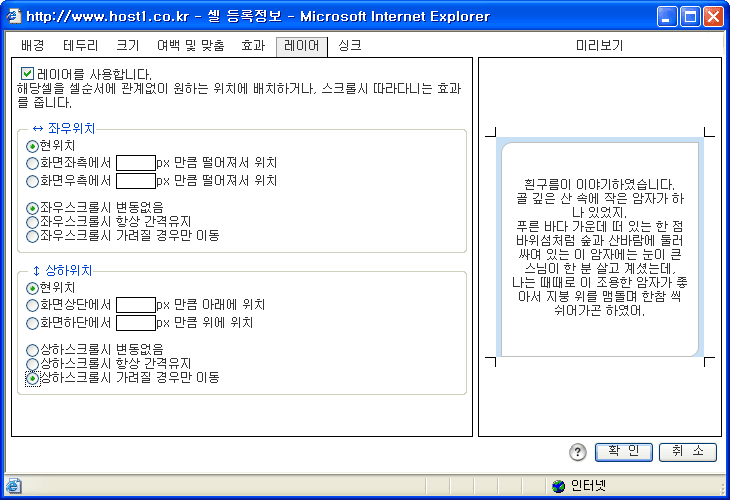 레이어를 사용하면 셀의 위치를 셀의 구조와 관계없이 특정좌표에 위치시킬 수 있습니다.또한 화면스크롤시 따라다니는 배너판과 같은 효과를 줄수도 있습니다. ![]() 위처럼 레이어속성을 설정했을경우(우측의 빨간테두리가 있는 셀에 적용한예) 아래화면처럼 상하 스크롤시 화면이 가려지는 경우 자동으로 움직이는 효과를 줄 수 있습니다. ![]() ![]() 좌,우 위치를 강제로 설정했을 경우에는 아래화면처럼 특정위치로 셀의 위치를 변경할수도 있습니다. ![]() |