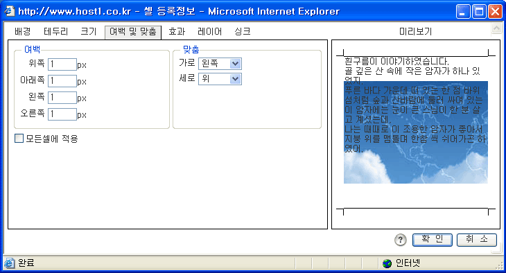![]() 셀의 여백 및 맞춤을 설정하는 화면입니다. 셀의 내용의 위치를 여백설정 및 맞춤설정으로 원하는곳에 위치시킬 수 있습니다. 실제로 여백크기를 입력해보거나 맞춤설정을 해보시면 미리보기에서 바로 확인할 수 있으므로 이해가 쉽게 되실겁니다. 모든 셀에 적용 : 설정한 옵션을 전체셀에 적용시키고자 할때 하나의 셀에서만 설정하고 이것을 선택하면 페이지내 모든 셀의 배경이 적용됩니다. 자식셀에서 모든셀이란 해당 자식셀이 포함된 독립 셀내로 한정됩니다. |