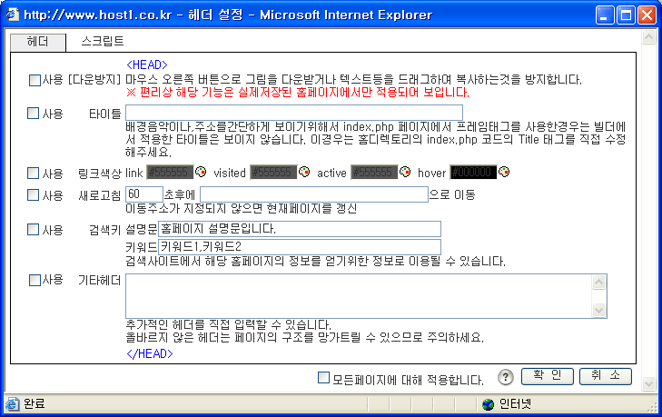 페이지 헤더 및 하단에 추가로 삽입할 태그 및 코드를 지정할 수 있습니다. ![]() 다운방지 : 마우스 오른쪽 버튼 클릭하여 이미지를 다운받거나 텍스트등을 드래그하여 복사하는것을 방지합니다. 작업편리상 빌더작업화면에서는 적용되지 않고 실제 저장된 홈페이지에서만 적용됩니다. 타이틀 : 웹브라우저 상단에 보이는 제목을 지정합니다. 미지정시 해당 페이지 메뉴명이 자동으로 보입니다. 링크색상 : 기본 링크색상외 다른 링크색상을 지정하고자 할때 사용합니다. 대부분의 모듈에서는 자체 링크설정을 합니다. 기타 HTML삽입모듈등 자체 링크설정을 지정하지 않은 모듈등에서 적용이 됩니다. link(기본 링크색상), visited(한번이라도 방문한 주소인경우 링크색상), active(클릭시 색상), hover(마우스 오버시 색상) 새로고침 : 현재페이지에서 특정시간이 지난후에 자동으로 임의의 페이지로 이동하도록 설정합니다. 0초로 지정하면 지체없이 지정된 페이지로 이동합니다. 검색키 : 페이지의 성격을 말해주는 설명문 및 키워드를 지정합니다. 일부 검색 사이트에서 홈페이지의 정보를 얻기위한 정보로 이용될 수 있습니다. 기타헤더 : 기타 HEAD 내에 삽입할 수 잇는 HTML 태그(style,script 등)를 직접 입력합니다. 스크립트 : 사용자 스크립트를 지정합니다. 기타헤더에서 지정하는 스크립트는 페이지 상단에 삽입되는 스크립트이고 이곳에 지정하는 스크립트는 페이지 하단부에 삽입됩니다. 모든페이지에 적용 : 기본적으로 헤더 설정은 페이지별로 설정합니다. 모든페이지에 동일한 헤더설정을 적용하고자할때 선택하세요. |