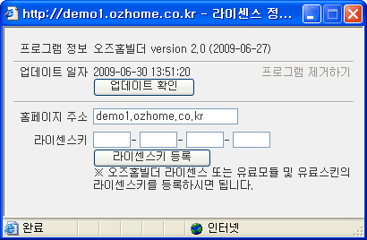 패키지용 빌더에서 사용가능한 메뉴입니다.라이센스 구매후 해당 라이센스 키를 등록하는 곳입니다. 빌더 라이센스 뿐만 아니라 추가로 구매하는 모듈 및 스킨 라이센스 키도 이곳에서 등록하시면 됩니다. 업데이트는 기본적으로 매주마다 정기적으로 자동 업데이트 됩니다. 필요에 따라 [업데이트 확인] 버튼을 눌러 실시간으로 업데이트를 할 수 있습니다. 설치한 빌더 프로그램을 제거하려면 [프로그램 제거하기]를 클릭하시면 됩니다. 단, 제거시 모든 빌더자료가 삭제되니 주의하시기 바랍니다. ![]() |