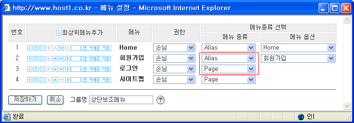 [회원가입] 페이지는 실제 페이지를 생성하지 않고 기본생성되는 회원가입페이지(menu_id=3)로 Alias 를 해놓았습니다.