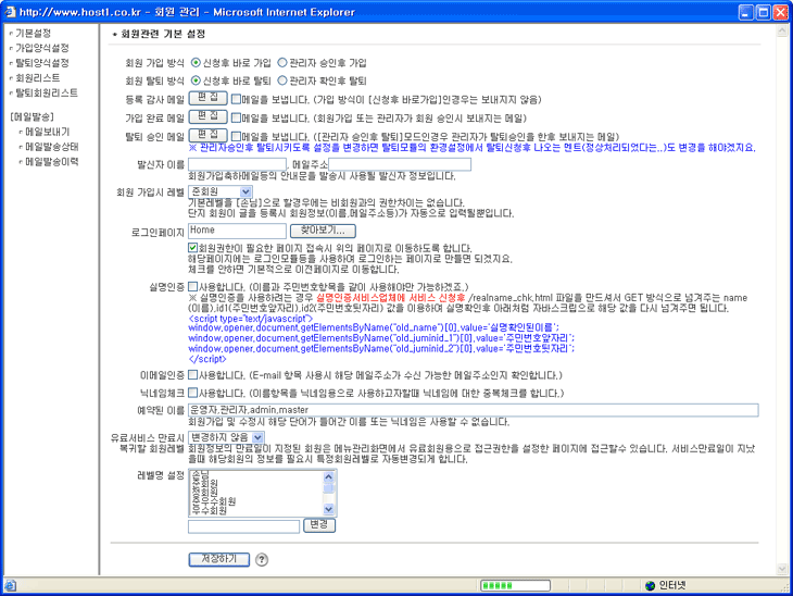 ![]() 회원가입방식 : 관리자승인후 가입으로 설정시는 관리자가 [회원리스트]에서 가입한 회원에 대해 [회원승인]을 해야만 합니다. 회원탈퇴방식 : 관리자확인후 탈퇴 설정시는 탈퇴신청즉시 탈퇴가 되지 않고 관리자가 [탈퇴회원리스트]에서 해당회원에 대해 [탈퇴승인]을 해야처리됩니다. 등록감사메일 : 회원가입방식이 관리자승인후가입방식일경우 회원가입 신청자에게 회원승인이 이루어지기전에 보내지는 메일입니다. 가입완료메일 : 회원으로 승인되는순간 보내지는 메일입니다. 가입후바로 가입시에는 바로 보내지게되고 관리자승인후 가입시에는 관리자가 승인을 해야만 보내집니다. 탈퇴승인메일 : 관리자확인후 탈퇴하도록 설정되어 있을경우에 관리자가 [탈퇴승인]을 할때 보내지는 메일입니다. 발신자이름,메일주소 : 위의 메일을 보낼때 발신자의 정보를 지정합니다. 회원가입레벨 : 회원으로 승인시 기본적으로 부여되는 권한을 지정합니다. 기본레벨을 [손님]으로 할경우에는 비회원과의 권한 차이는 없습니다. 단지 글등록시 회원정보(이름,메일주소등)가 자동으로 입력될 뿐입니다. 로그인페이지설정 : 접근하려고하는 페이지가 회원권한이 필요한 페이지일 경우 지정한 페이지로 이동을 하게 시킵니다. 지정하지 않으면 기본적으로 이전페이지로 되돌아갑니다. 해당 페이지에서는 로그인 하는 화면으로 구성하면 될것입니다. 좀더 자세한 설명은 [로그인 전용페이지 만들기]를 참조하세요 실명인증 : 회원가입 및 회원정보 수정시 실명인증 하도록 설정합니다. 단, 실명인증 서비스업체에 직접 서비스는 신청하셔야 합니다. 서비스 신청후 업체에서 제공하는 실명인증 처리 파일을 홈디렉토리에 /realname_chk.html 로 만듭니다. 빌더에서 GET 방식으로 넘겨주는 name(이름),id1(주민번호앞자리),id2(주민번호뒷자리) 값을 이용하여 실명확인후 아래처럼 자바스크립으로 해당 값을 다시 넘겨주면 됩니다. <script type="text/javascript"> window.opener.document.getElementsByName("old_name")[0].value='실명확인된이름'; window.opener.document.getElementsByName("old_juminid_1")[0].value='주민번호앞자리'; window.opener.document.getElementsByName("old_juminid_2")[0].value='주민번호뒷자리'; </script> 위의 내용을 해당 서비스업체에 알려주면 쉽게 해당 파일은 만들어 줄것입니다. 이메일 인증 : 회원가입시 및 회원정보 수정시 기재한 이메일로 받은 인증코드를 입력해야 가입처리가 되도록 합니다. 닉네임 체크 : 회원가입시 실명을 입력 받는 대신 이름항목을 닉네임용으로 사용시 닉네임이 중복되면 회원간 혼동이 오므로 중복여부를 체크하는 기능입니다. 예약된 이름 : 회원가입 및 수정시 해당 단어가 들어간 이름 또는 닉네임은 사용할 수 없도록 합니다. 여러 단어를 콤마로 구분하여 지정 가능합니다. 유료서비스 만료시 : 회원정보중 [만료일]항목이 있습니다. 페이지 또는 게시판의 권한설정에서 특정 권한 이상으로만 설정하고 만료일이 지나면 강제로 회원등급을 강등시켜 접근 못하게 할때 유용합니다. 레벨명 설정 : 기본으로 지정된 회원 레벨명을 원하는 대로 수정 가능합니다. |
