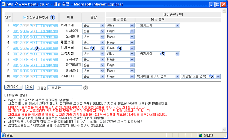 기본메뉴 : 홈페이지의 메인메뉴그룹 입니다.