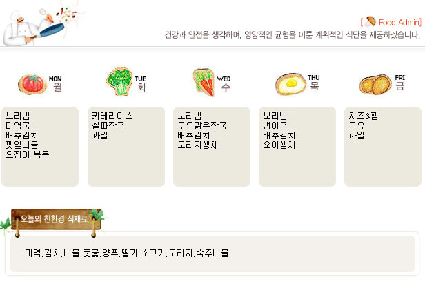 주간식단표 모듈 추가 오즈웹2009.04.10 06:10:35 조회7033 아래 그림처럼 간단한 주간식단표를 보여줄수 있는 모듈이 추가되었습니다. 홈페이지 관리권한의 계정으로 로그인하시면 우측상단의 [Food Admin] 을 클릭해서 식단표를 실시간으로 수정할수 있습니다. 모듈위치 : 오즈웹빌더/잡동사니/주간식단표 사용권한 : Standard 웹호스팅 서비스 이상의 고객 빌더 2.0에서 사용하던 모듈(빌더3.0이상에서는 지원하지 않는 모듈입니다)