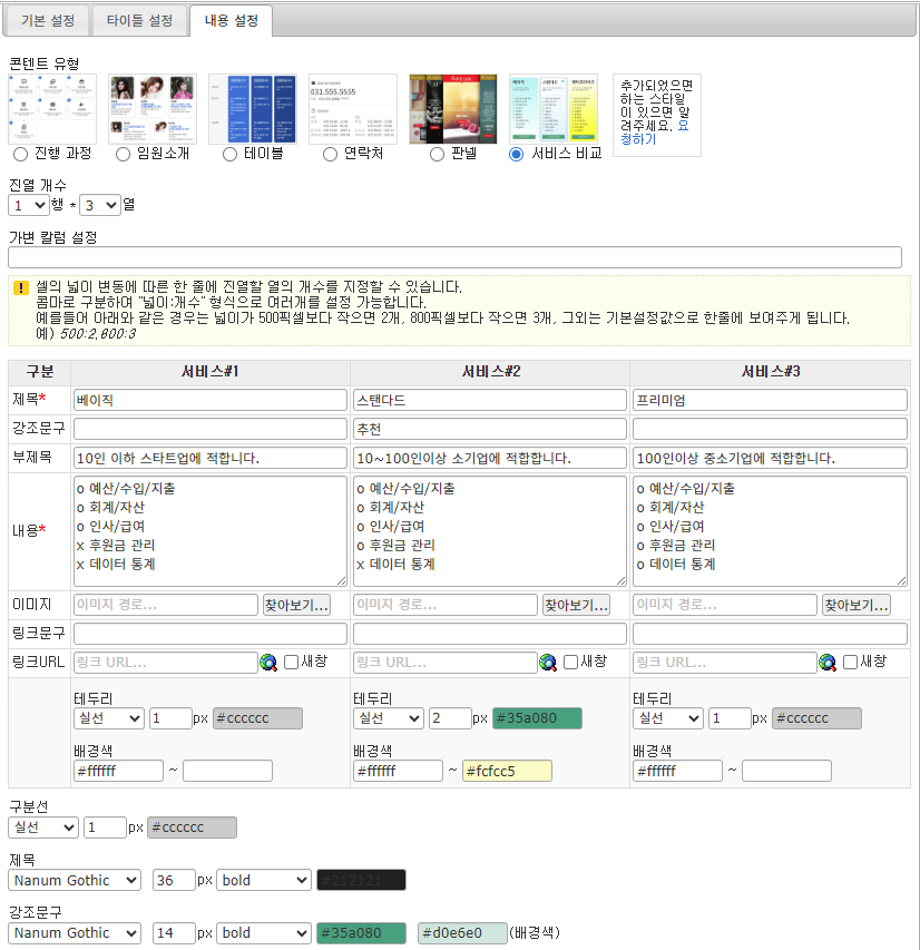 홈페이지빌더 - 잡동사니/페이지꾸미기 모듈에 서비스 비교기능 콘텐트가 추가되었습니다. 오즈웹2026.02.24 14:48:28 조회630 오즈홈빌더에서 잡동사니/페이지꾸미기 모듈 및 웹에디터 위젯중 "콘텐트박스" 위젯에서 아래와 같이 서비스 또는 제품사양을 비교하는 콘텐트를 쉽게 구성할 수 있는 기능이 추가되었습니다.